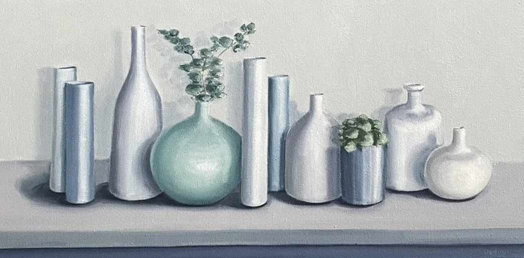 I find inspiration from taking everyday things and elevating them to something beautiful and positive. I strive to create an atmosphere with my works; conveying the calmness and serenity of the sea or Morandi inspired clusters of pots and vessels, or the uplifting and cheerful vibrancy of fruits and foliage. My focus is the sense of place, or essence of the object rather than a strict representation of it.